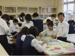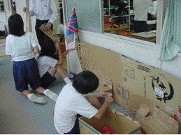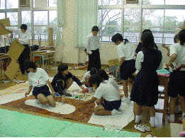 私たちは,生麦事件・薩英戦争の劇をします。この劇は,「CSの時間」調べたことを生かしたり,図書室で本を借りたりして,シナリオを作りました。道具も全員で分担して,助け合いながら一生懸命作りました。うまくいかないところもあり,作り直しもたくさんしました。私たちの一番工夫したところは,一つ一つの道具をていねいに作ったことです。劇の練習では,初めふざける人がほとんどでした。けれども,文化祭に向けての決意を話合って,次第に全員が劇にも協力してくれるようになりました。全員が,準備も部隊も参加した劇ができたので見て下さい。