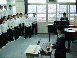 1年2組は,合唱で「この星に生まれて」と「君こそスターだ!」を歌います。私たちのクラスでは,放課後や音楽の時間を使いながら,たくさん練習をしてきました。「この星に生まれて」は,7月にあった合唱コンクールで最優秀賞をとった曲で,私たちにはとても思い出のある曲です。また,「君こそスターだ!」はアテネオリンピックの応援ソングでした。とてもいい曲なので,この曲の感じをこわさないように歌い方にいろいろと注意してきました。
