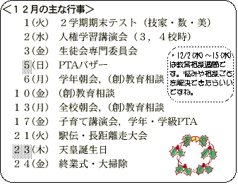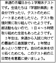 さて,自分たちの学級や学校生活が,楽しく充実したものになるためには,このような生徒会を中心とした取組が不可欠です。みなさん全員の力,1人1人の力で学年目標にむけて協力していってくれることを期待しています。