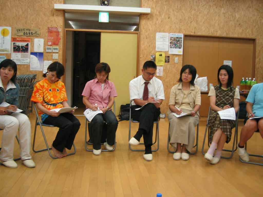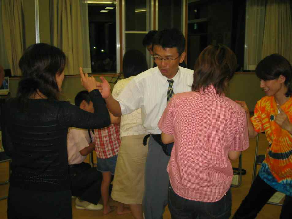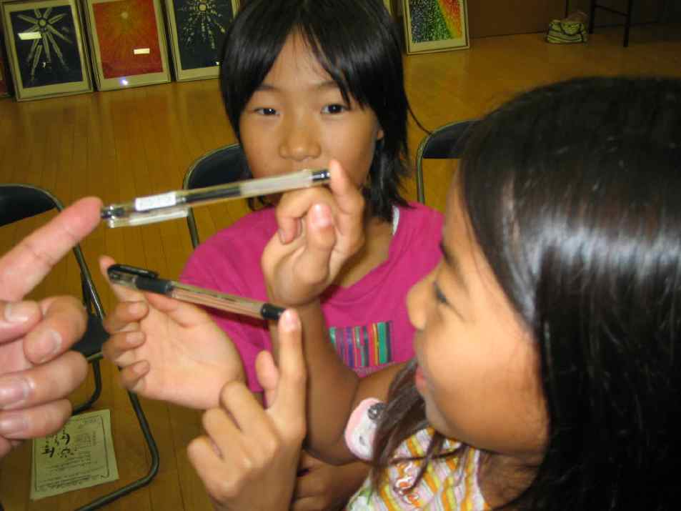 小学生も混じって,ペン交換のワーク。二人ペアーで指をペンをはさみます。それを,今度は別のペアと交換します。2組のペアの息が合うことが大切。2組のペアと交換します。「たとえ,落としてもまた拾ってやり直せばいいだけ」「拾い上げることでまたつなぎ合わせることができる」「自分の思いはまた人につながってわたっていく」そんな思いを実感を伴って経験していきます。